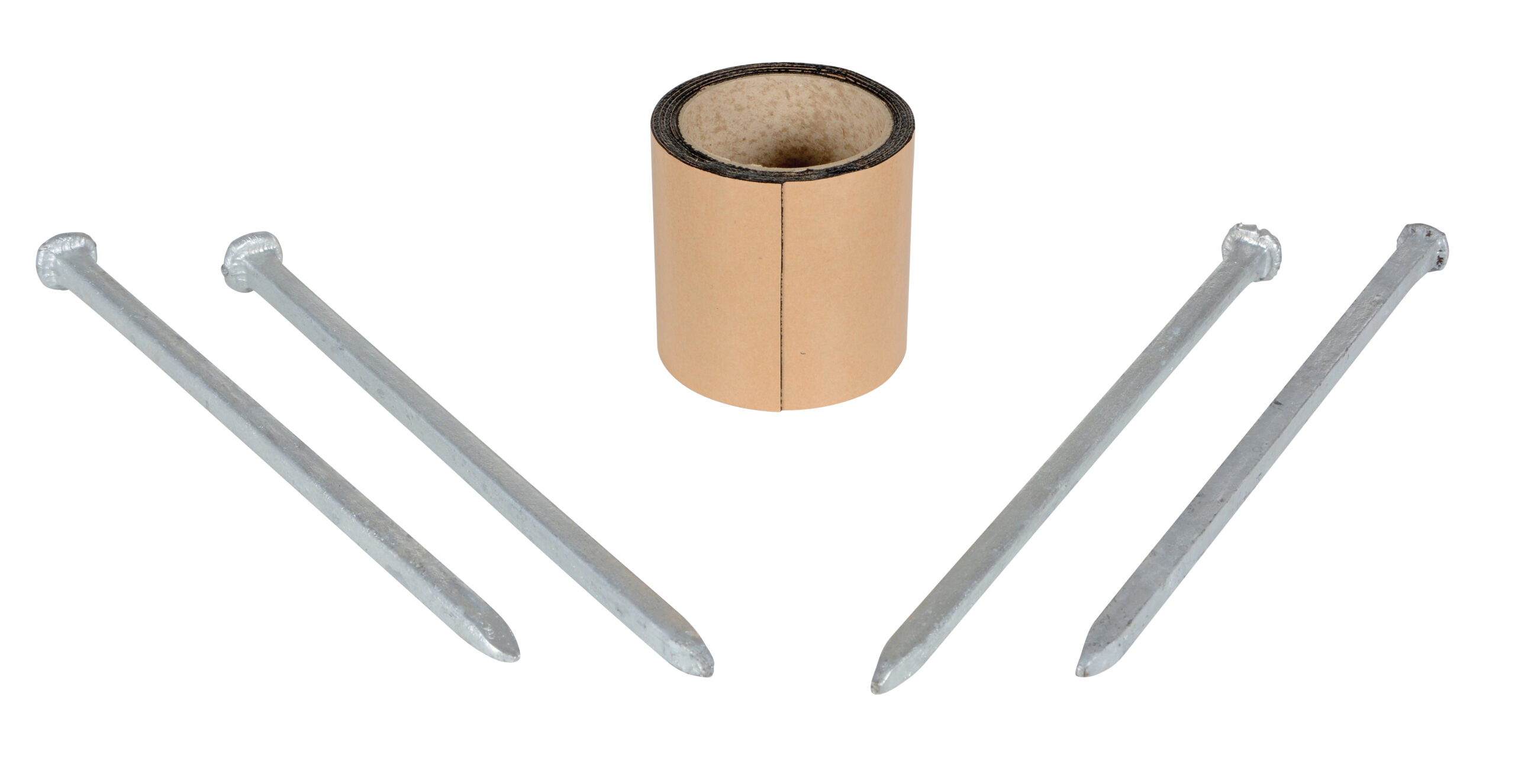 Car stop asphalt Hardware Kit with 1 roll of butyl tape and 4 spikes.